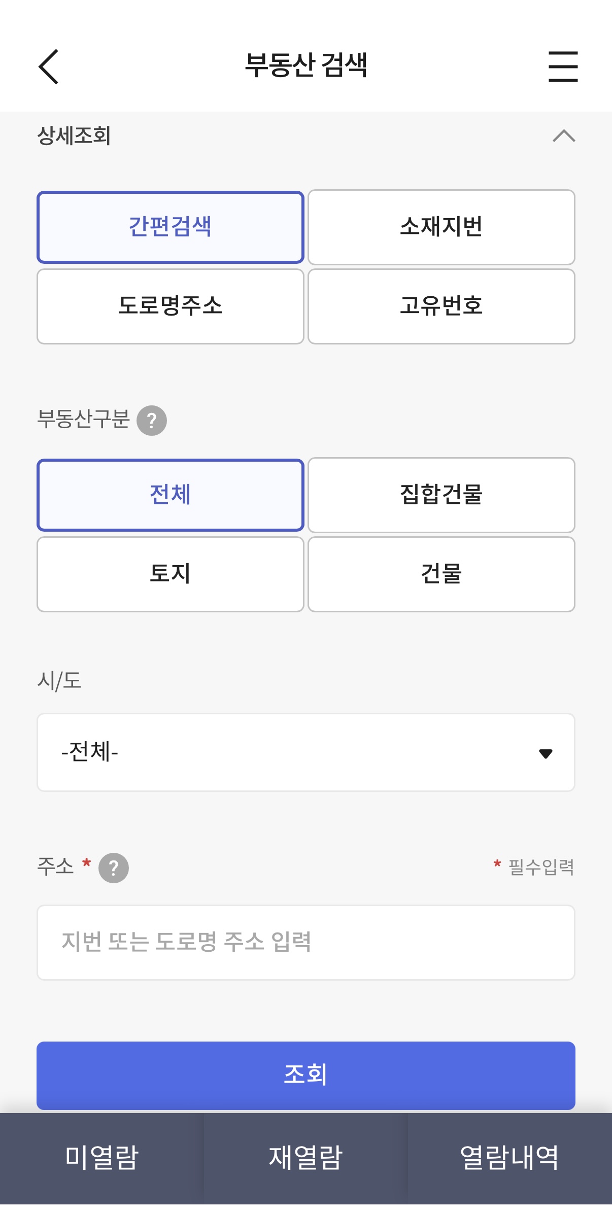 발급받고자 하는 부동산의 주소(지번, 도로명, 건물명 등)를 입력하고 검색합니다.