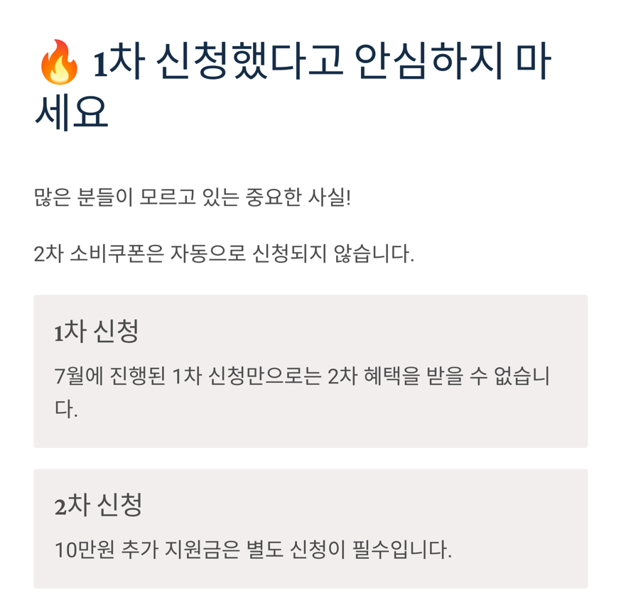 많은 분들이 1차 소비쿠폰 신청 후 안심하고 계시지만, 실제로는 2차 소비쿠폰이 별도로 존재하며 자동으로 신청이 연동되지 않습니다. 이 말은 곧, 한 번 더 신청을 하지 않으면 10만 원을 받을 수 없다는 뜻이기도 합니다.